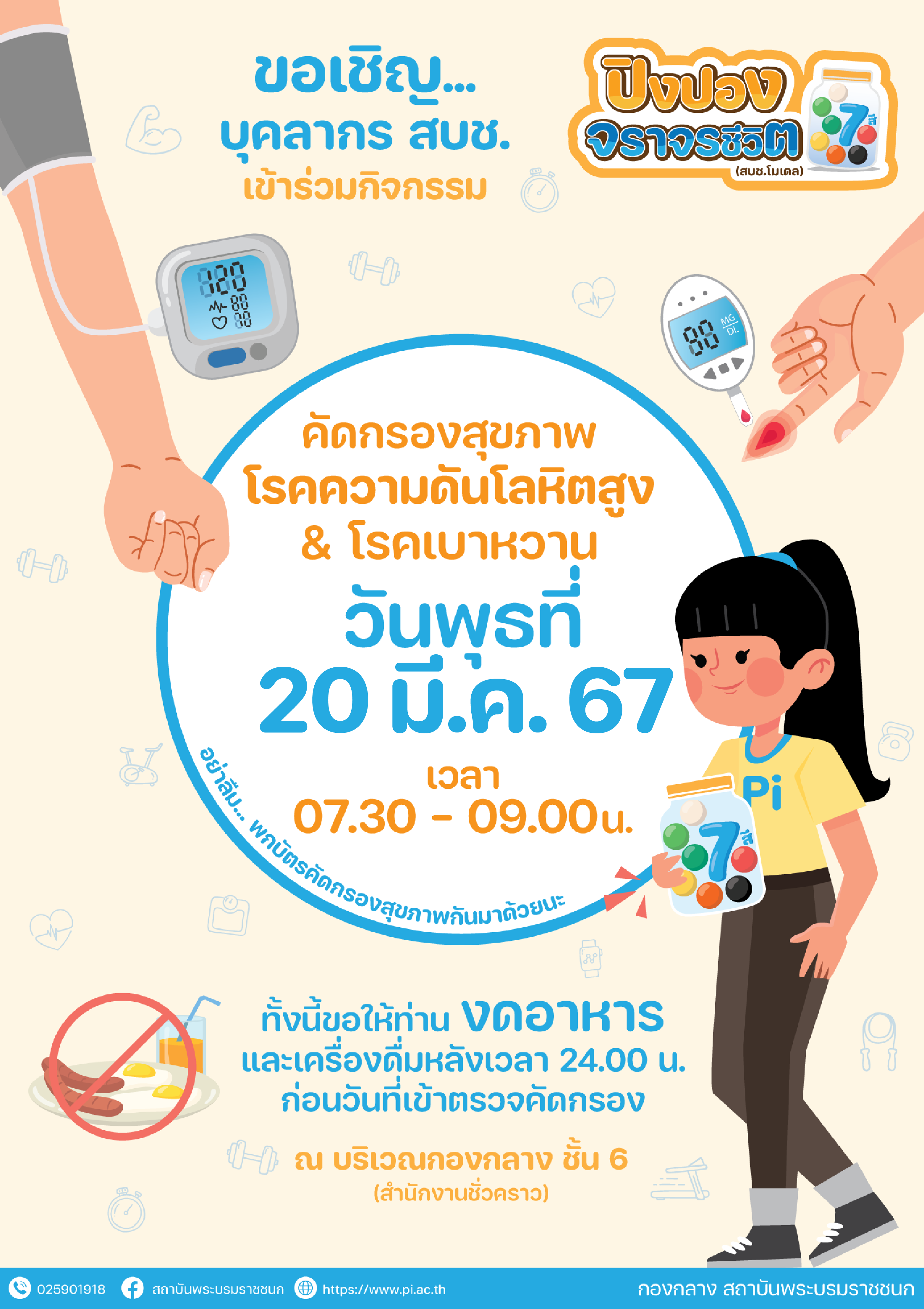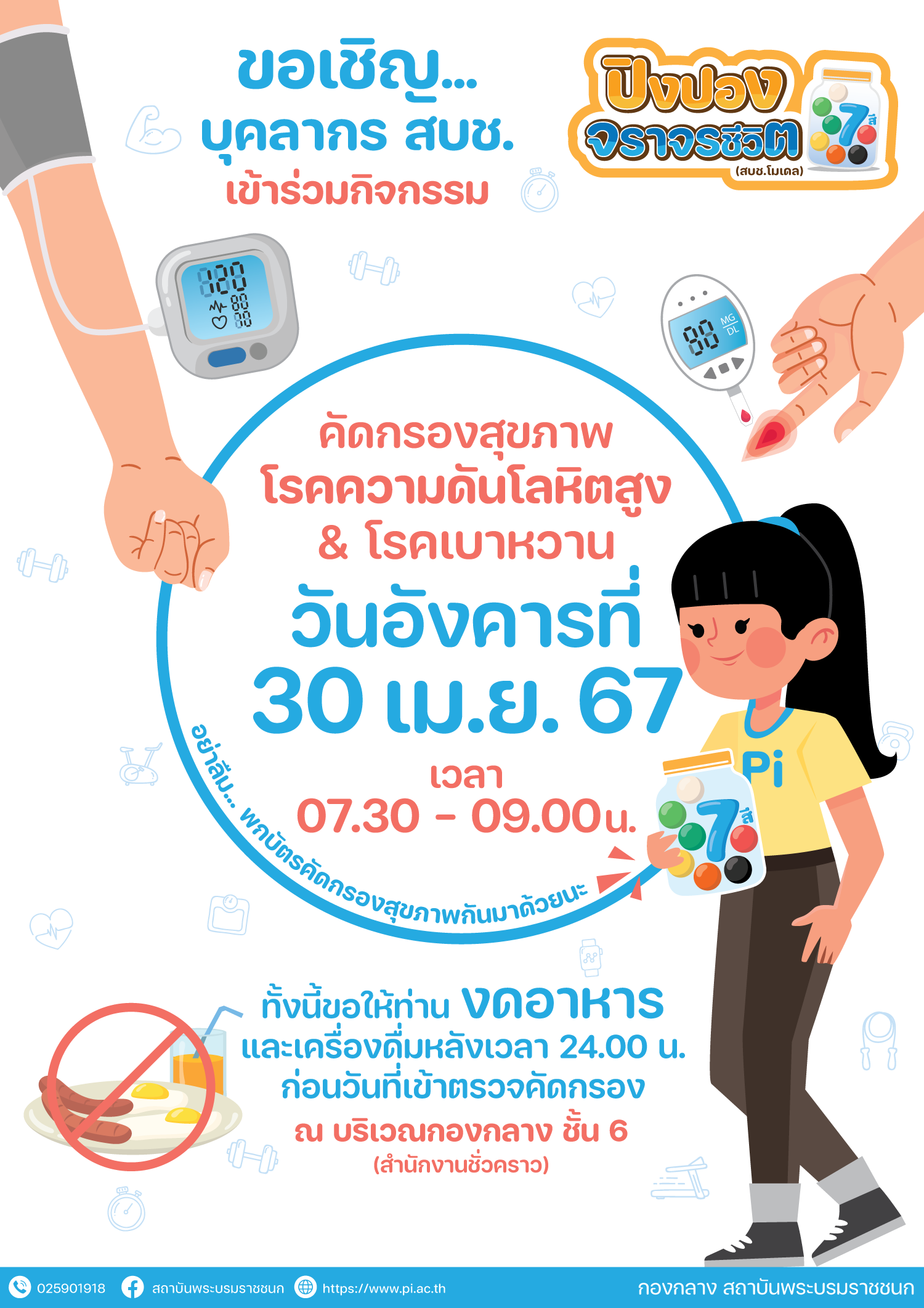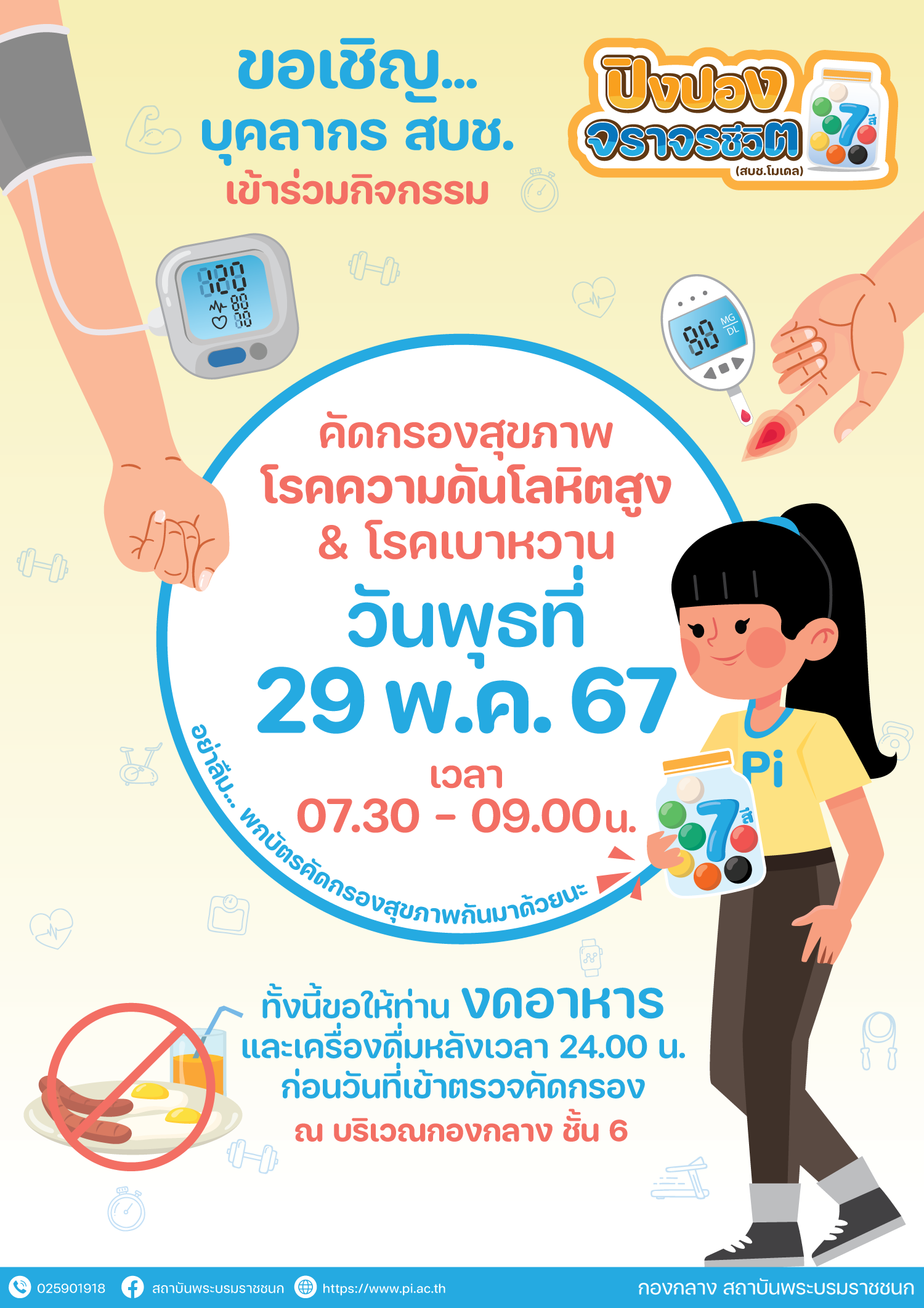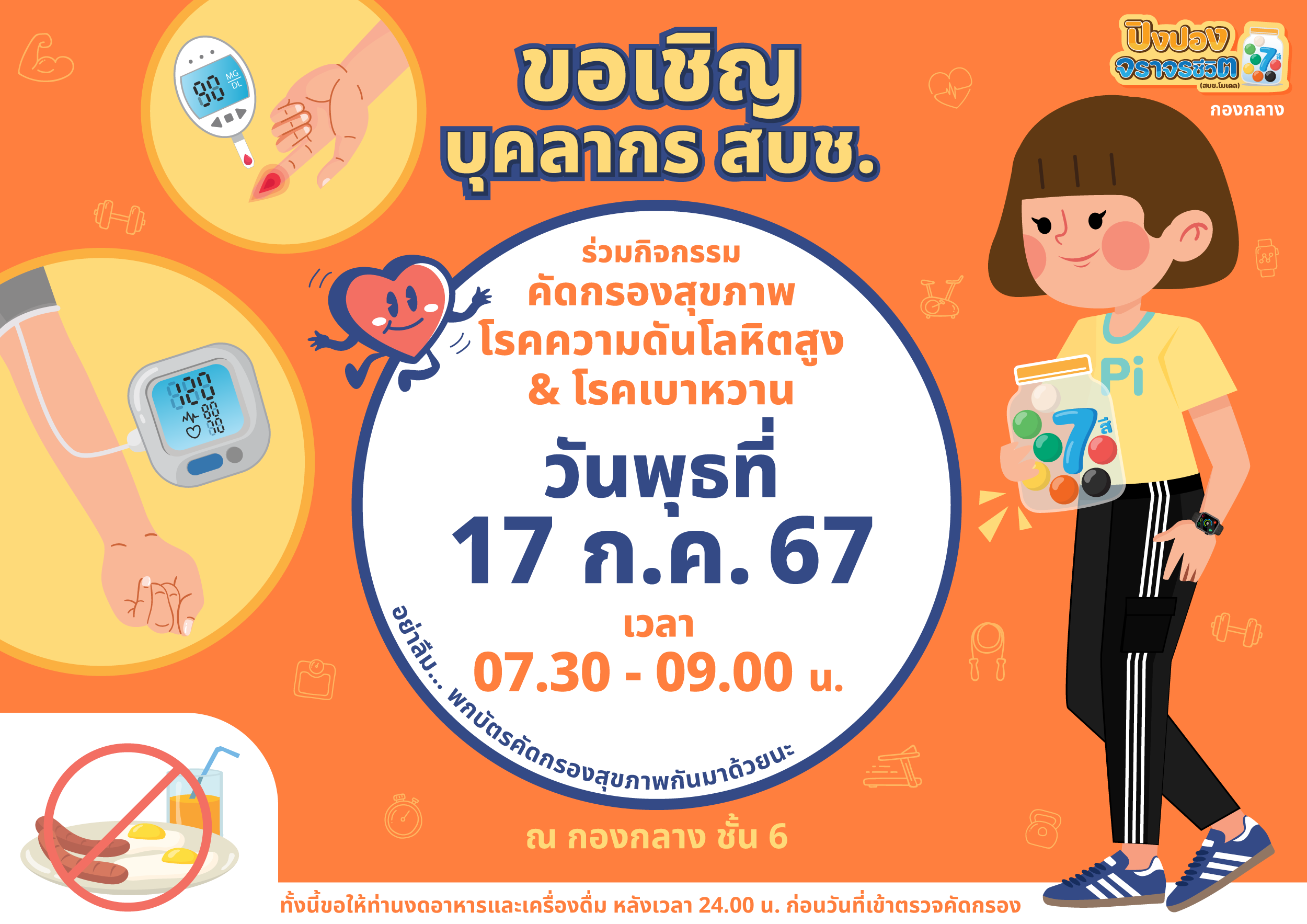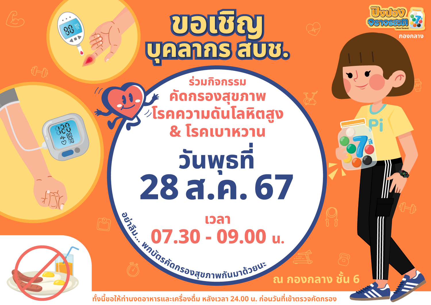 <p><span style="font-size:16px;">ขอเชิญบุคลากรสบช.เข้าร่วมกิจกรรมคัดกรองสุขภาพโรคความดันโลหิตสูงและโรคเบาหวาน ในวันพุธที่ 17 กรกฎาคม 2567 เวลา 07.30 - 09.00 น. </span></p> <p><span style="font-size:16px;">ทั้งนี้ขอให้ท่าน งดอาหาร และเครื่องดื่มหลังเวลา 24.00 น. ก่อนวันที่เข้าตรวจคัดกรอง ณ บริเวณกองกลาง ชั้น 6 </span></p>